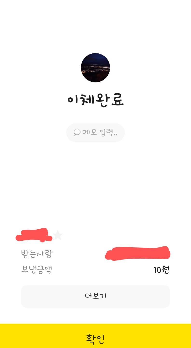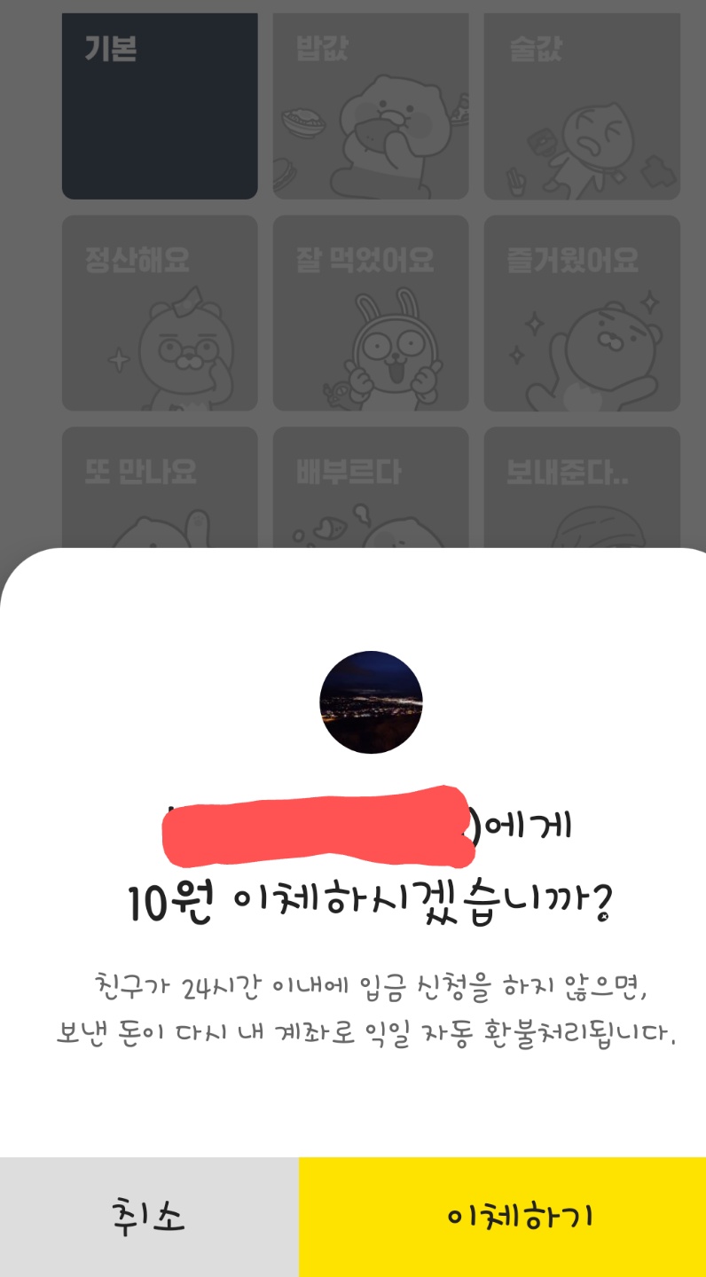 와우! 메세지 보내는 것처럼 쉽지요? 물론 상대방이 24시간안에 입금 신청을 하지 않으면 보낸 금액은 다시 내 계좌로 자동환불 된답니다.