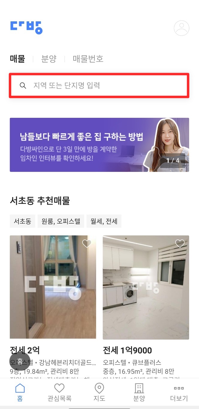 KB부동산 매물이 나오고 빨간 박스 안에 본인이 관심있는 단지, 지역, 지하철, 학교를 검색해주세요.