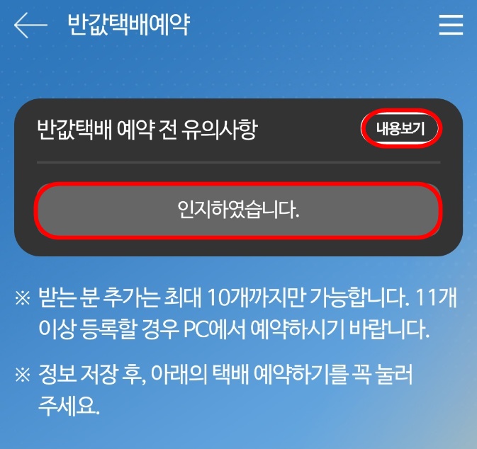 반값택배 예약 전 유의사항의 내용보기를 꼭 미리 확인하시고 '인지하였습니다' 버튼을 클릭해주시면 됩니다.