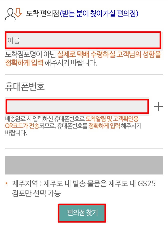 그리고 택배를 찾아가게 될 편의점 정보를 입력해주시면 편의점 찾기 탭으로 점포명이나 주소를 검색하여 선택하시면 됩니다.