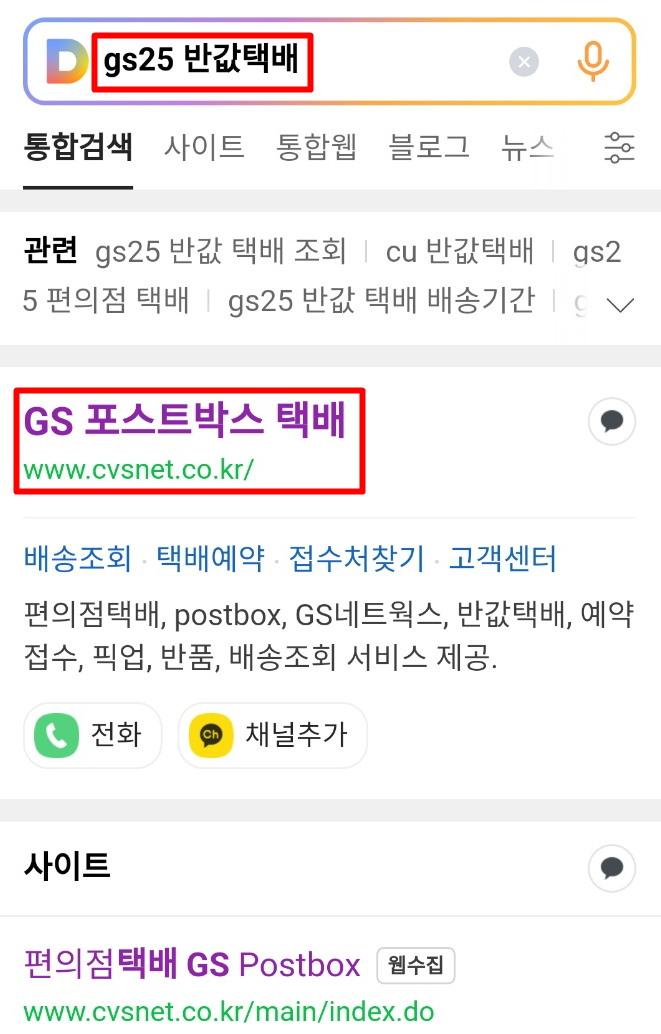 일단 가지고 계신 휴대폰으로 GS25 반값 택배라고 검색창에 조회를 하게되면 검색창 아래에 GS 포스트박스 택배라는 글자를 보실 수 있습니다.