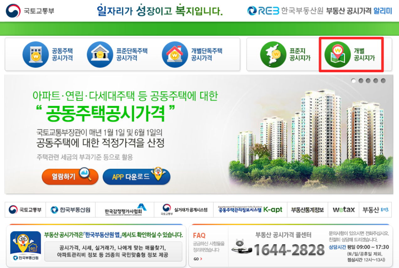 다시 메인 홈페이지로 돌아와 오른쪽 맨 상단에 개별 공시지가 메뉴탭을 클릭해주세요.