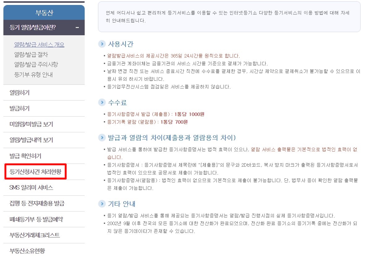 현재를 기준으로 2개월 이내에 처리완료되었거나 처리중인 신청사건처리내역을 접수번호나 소재지번을 통해 조회하는 화면입니다. 메뉴 들어가기 1. 화면 상단의 대메뉴 중 ‘등기열람/발급’