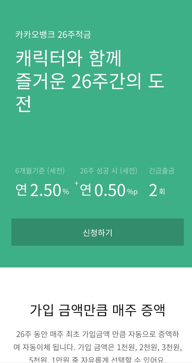 26주 동안 매주 최초 가입금액만큼 자동으로 증액하여 자동이체가 되며, 가입 금액은 1천원, 2천원, 3천원, 5천원, 1만원 중 자유롭게 선택이 가능하니 본인이 원하시는 금액을 선택하시면 될 것 같습니다.