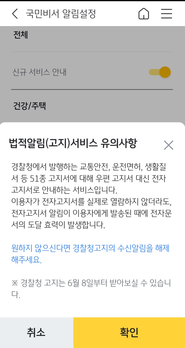 이것을 하기에 앞서 법적알림(고지)서비스 유의사항을 확인하신 후에 진행을 하시면 될 것 같습니다. 위에 나와 있는 내용을 보자면 경찰청에서 발행하는 교통안전, 운전면허, 생활질서 등을 전자고지서로서 안내한다는 서비스입니다.